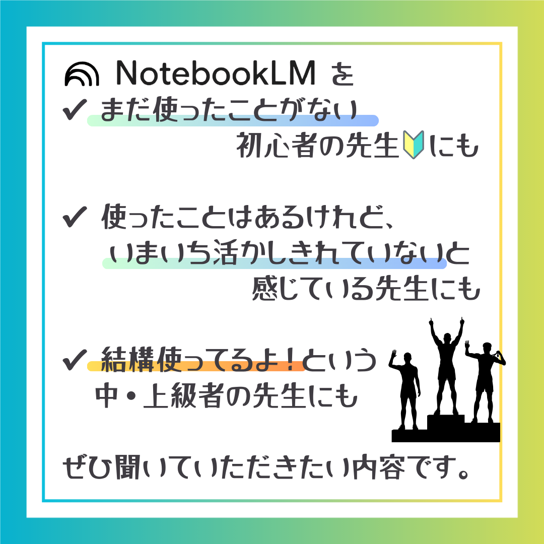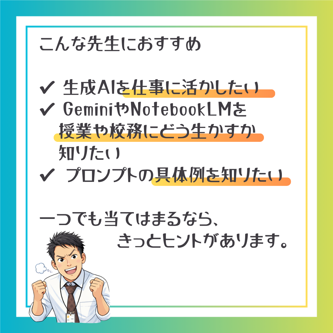 ✔ GeminiやNotebookLMを授業や校務にどう生かすか知りたい
