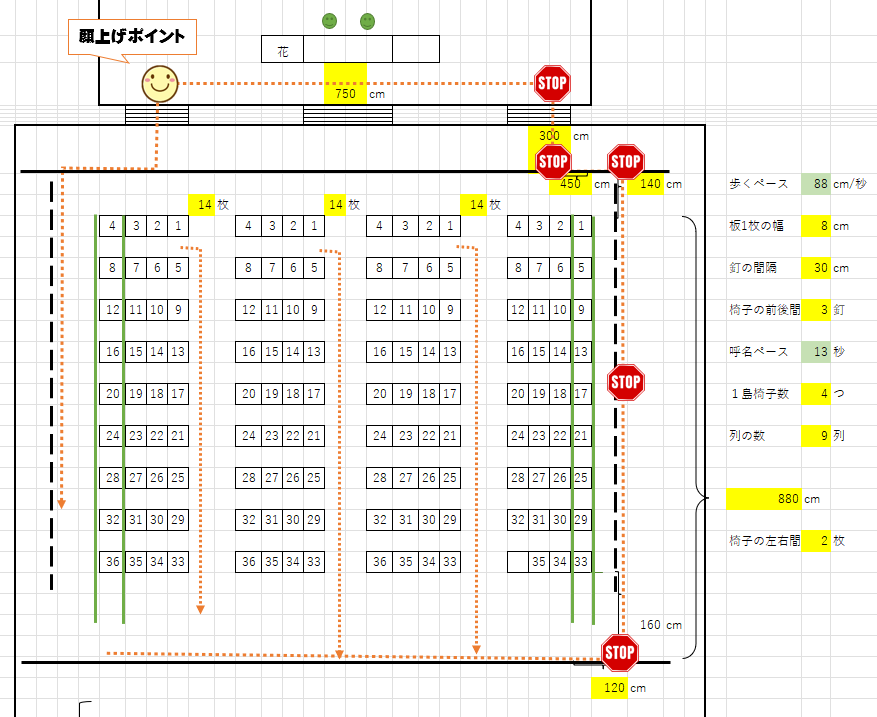 別れの言葉が全て終わったら、2拍ほど待って、1列目から座席へ
